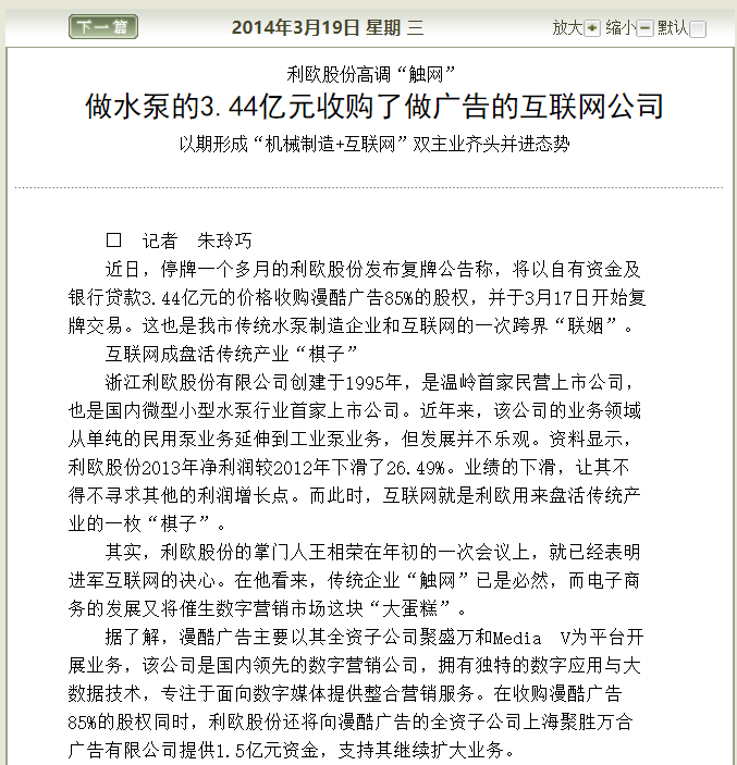 2014年利歐泵業(yè)發(fā)布復(fù)牌公告稱,將以自有資金及銀行貸款3.44億元的價格收購漫酷廣告85%的股權(quán),并于3月17日開始復(fù)牌交易。這也是我市傳統(tǒng)水泵制造企業(yè)和互聯(lián)網(wǎng)的一次跨界“聯(lián)姻”。下面是當(dāng)時的報紙報道: